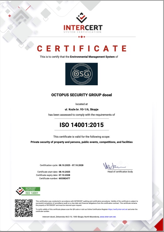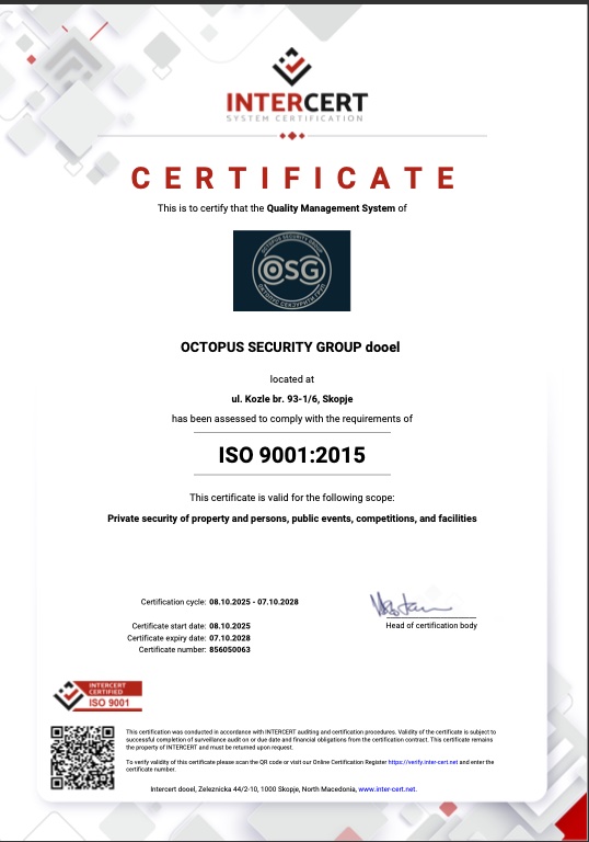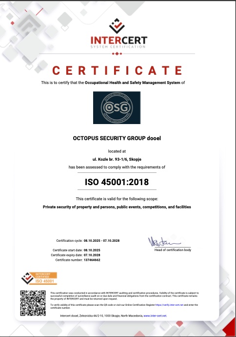 Агенција за обезбедување Октопус Секјурити Груп, лиценцирана агенција со големо искуство во областа на обезбедувањето.
